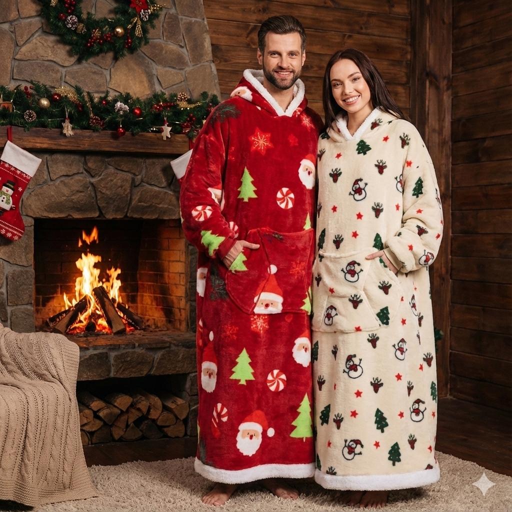 Med sin extra långa design (140 cm) täcker den hela kroppen – perfekt för filmkvällar, julmys eller lata söndagar. Utsida i mjuk, mönstrad flanell och insida i tjock, värmande sherpa-fleece. Årets roligaste (och skönaste) julklapp till dig själv eller någon du vill skämma bort.